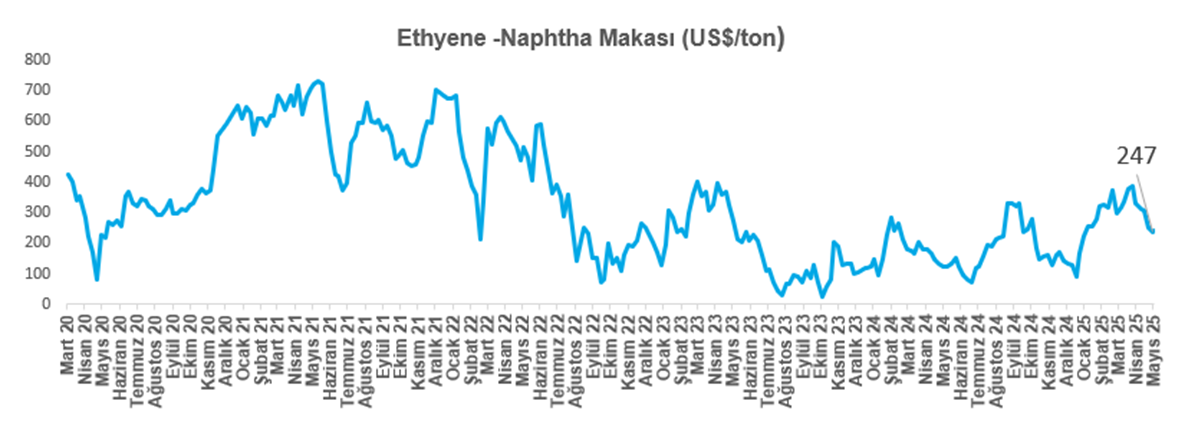 Etilen Nafta Makası 23 Mayıs itibariyle haftalık %3,6 artışla 247 dolar seviyesine yükseldi.